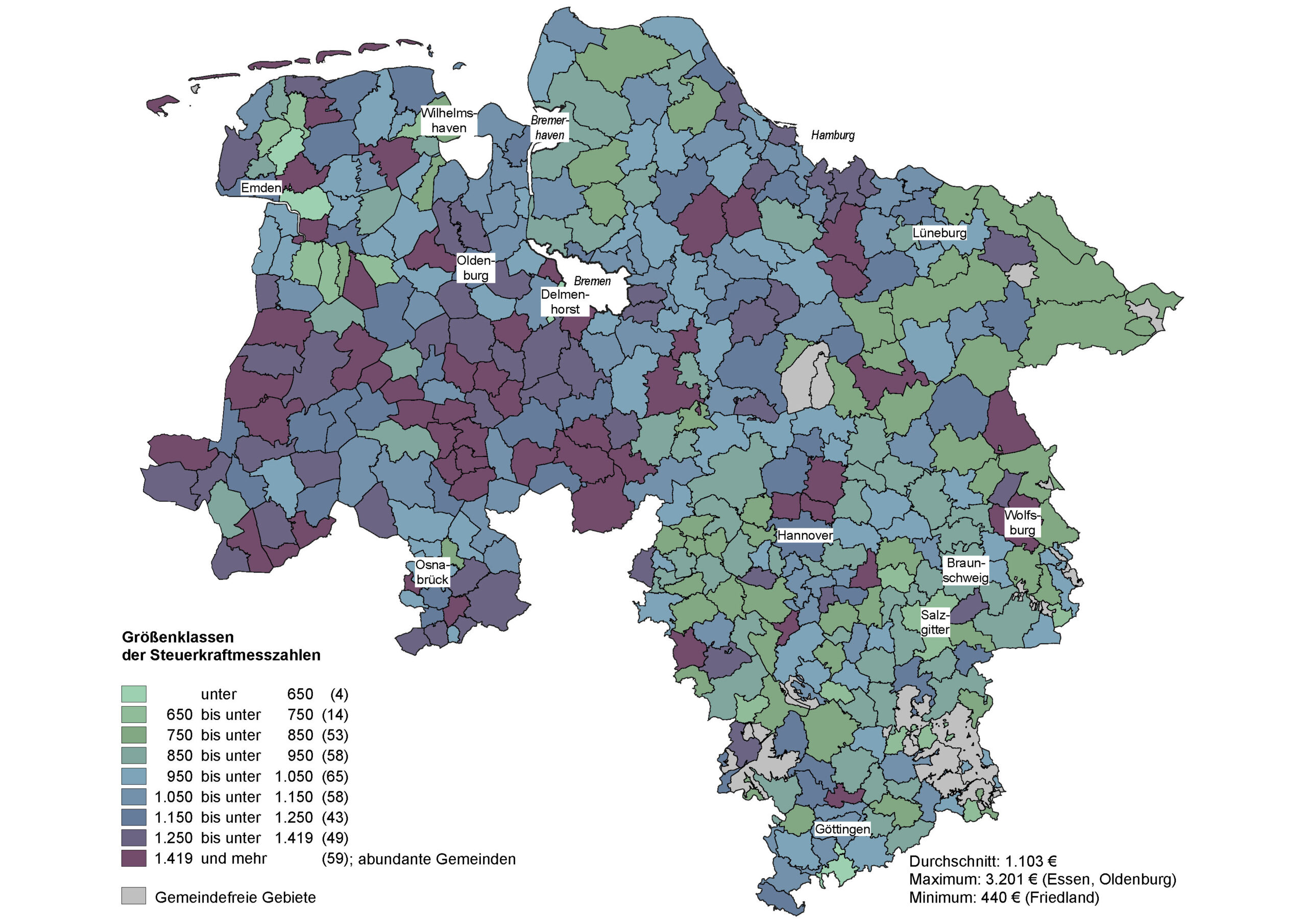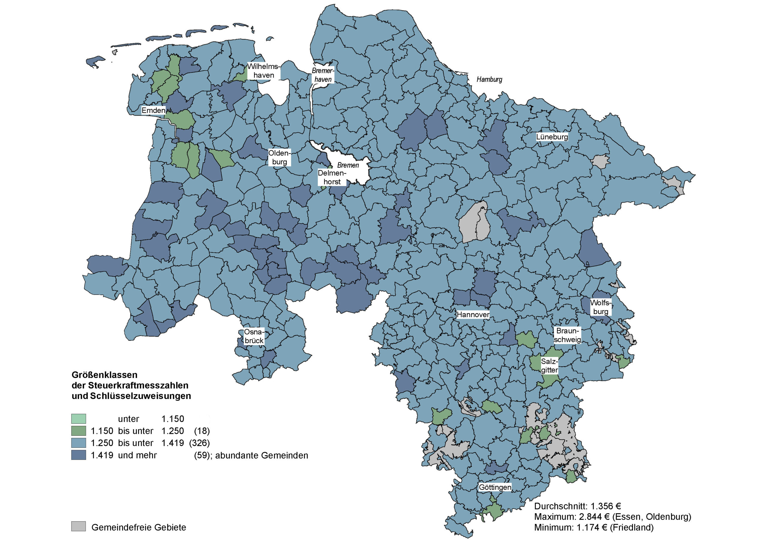In Tabelle T32Hierbei werden steuerstarke und steuerschwache Gemeinden unterschiedlicher Größe zusammengefasst. Aus unterschiedlichen Rängen auf Kreisebene kann daher nicht auf Übernivellierung durch Zahlungen im Rahmen des Finanzausgleichs geschlossen werden. Bei Betrachtung aller 403 Gemeinden einzeln (kreisangehörige Einheitsgemeinden und Samtgemeinden sowie kreisfreie Städte) bleibt die Rangfolge erhalten. sind die Schlüsselzuweisungen für Gemeindeaufgaben kreisweise dargestellt. Die höchsten Steuerkraftmesszahlen je Einheit des Bedarfsansatzes haben die Gemeinde Essen (Oldenburg) (3.201 €), die Inselgemeinde Juist (2.541 €) und die Gemeinde Baltrum (2.539 €). Die Gemeinde Essen (Oldenburg) sowie 53 weitere Städte und Gemeinden erhalten keine Zuweisungen für Gemeindeaufgaben und müssen eine Finanzausgleichsumlage zahlen.
