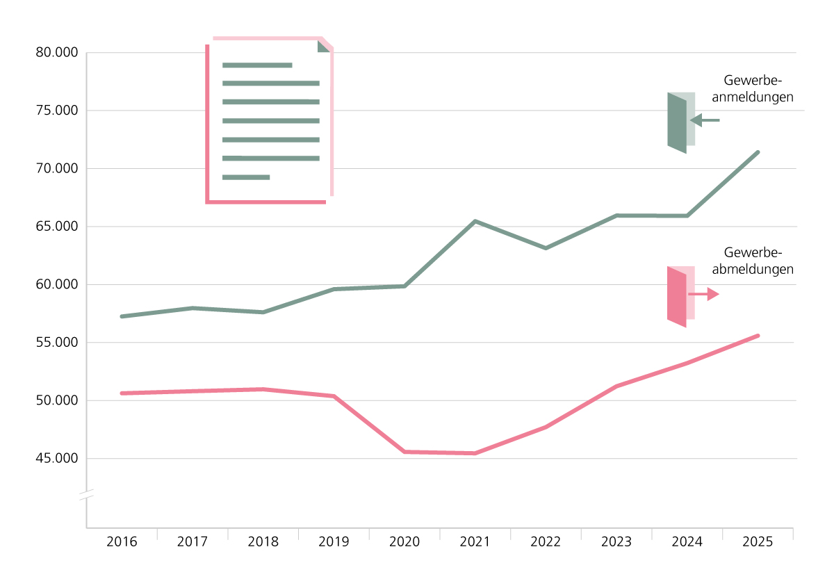 Mit einer Anzahl von 71.413 erreichten die Gewerbeanmeldungen bei den niedersächsischen Gewerbeämtern im Jahr 2025 den höchsten Stand der vergangenen 15 Jahre. Gegenüber dem Vorjahr war dies ein Anstieg von 8,3%. Die Zahl der Gewerbeabmeldungen in Niedersachsen hingegen lag im Jahr 2025 bei 55.591. Dies entsprach mit einem Plus von 4,4% zwar ebenfalls einem Anstieg zum Vorjahr (53.226 Abmeldungen), im Saldo lagen die Anmeldungen aber weiterhin deutlich über den Abmeldungen – der Überschuss betrug 15.822 Fälle.