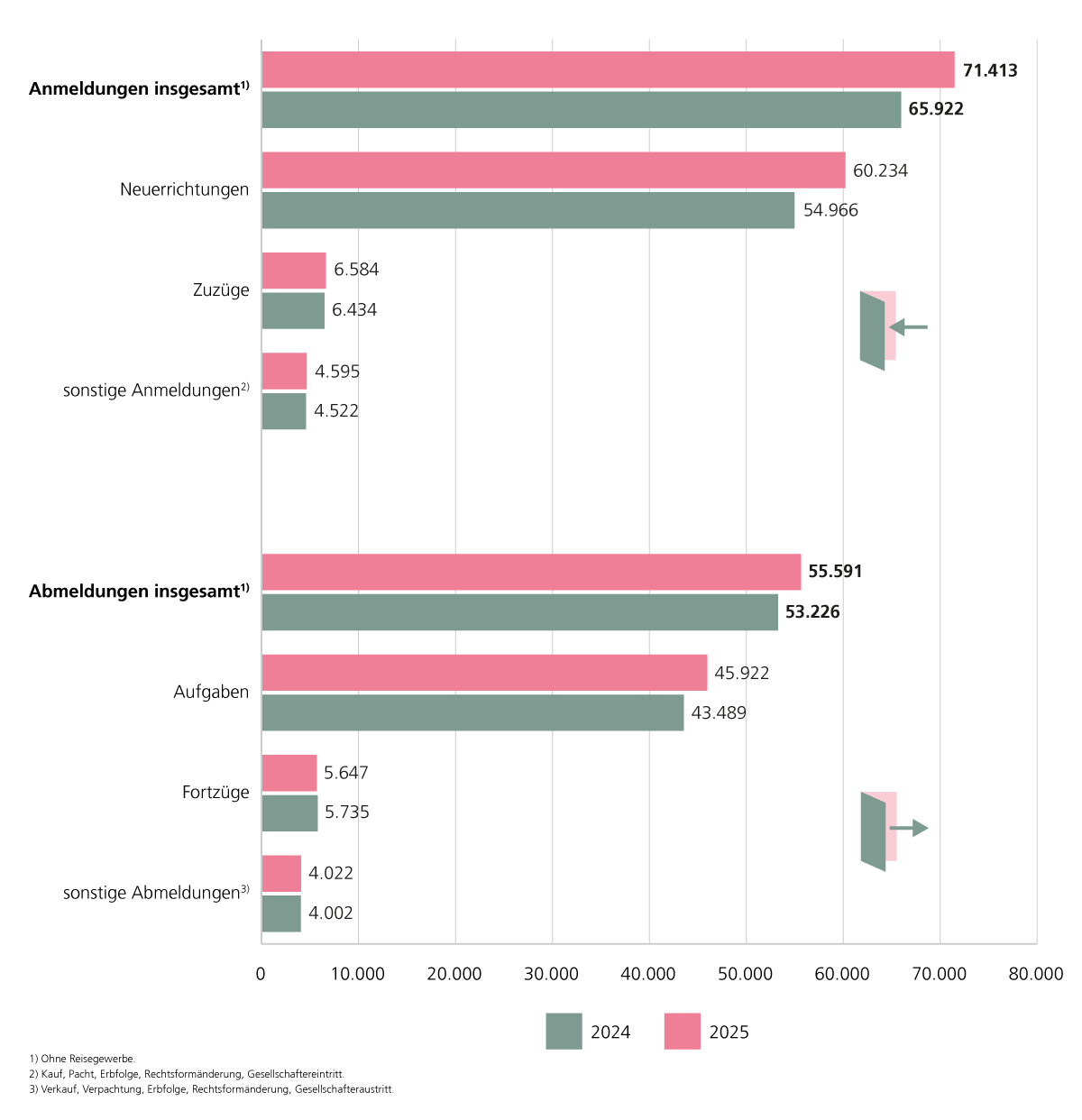 Die Neugründungen machten im Jahr 2025 insgesamt 84,0% der Gewerbeanmeldungen aus. Sie stiegen gegenüber dem Vorjahr deutlich um 9,6%.