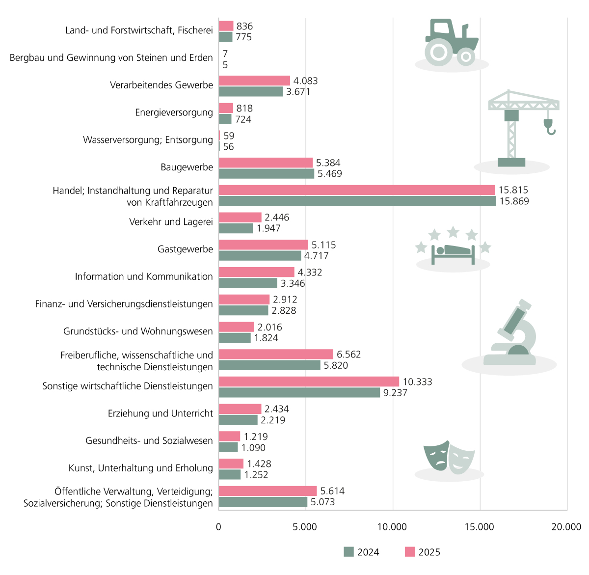Bei den sonstigen wirtschaftlichen Dienstleistungen, zu denen beispielsweise die Gebäudebetreuung sowie der Garten- und Landschaftsbau gehören, gab es 2025 mit einer Anzahl von 10.333 die zweithäufigsten Anmeldungen, was gegenüber dem Vorjahr eine Steigerung von 11,9% bedeutet. Bereits 2024 hatte es eine Steigerung in ähnlicher Größenordnung gegeben.