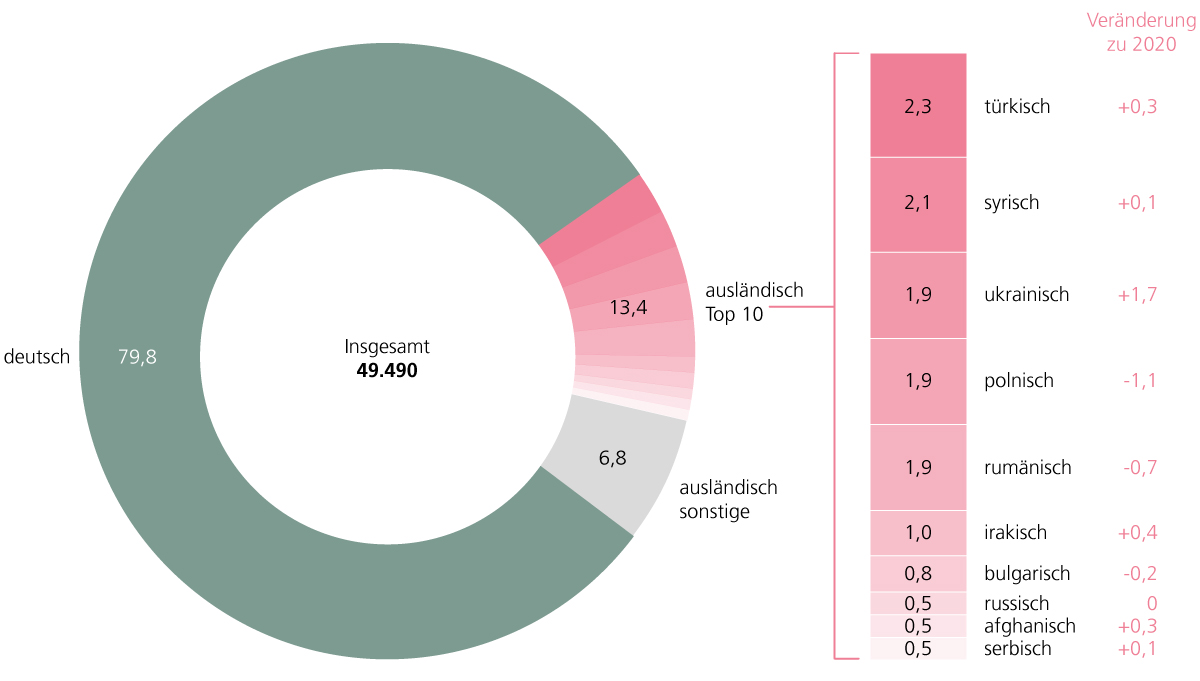 Ein weitaus dynamischeres Bild ergibt sich bei der Betrachtung nach ausländischen Nationalitäten. Von den insgesamt 49.490 Neugründungen der Einzelunternehmen entfielen 2,3% auf türkische und 2,1% auf syrische Staatsangehörige. Dahinter folgen mit einem Anteil von jeweils 1,9% die Anmeldungen von ukrainischen, polnischen und rumänischen Staatsangehörigen. Zum Vergleich: Im Jahr 2020 hatten polnische Staatsangehörige mit 3,0% noch auf Platz 1 gelegen, gefolgt von rumänischen (2,6%) und türkischen Staatsangehörigen (2,0%).