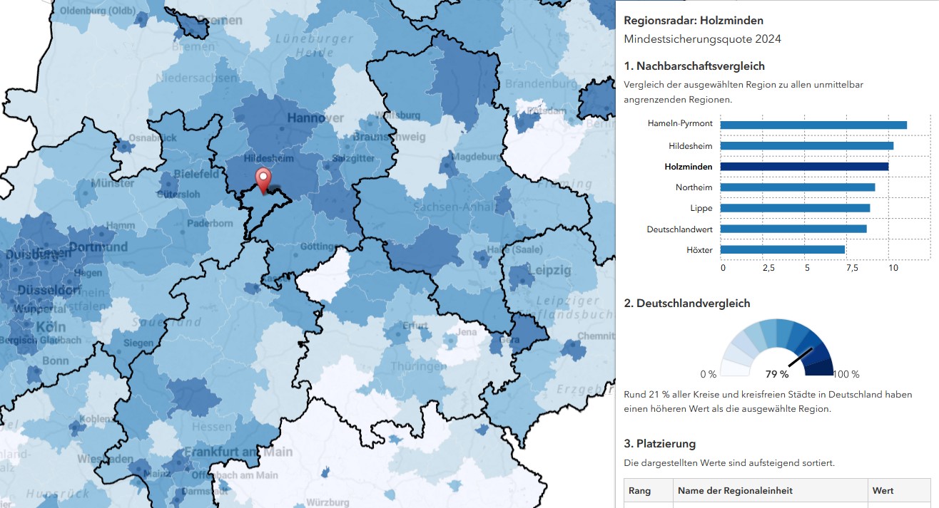 Darstellung der neuen Funktion "Regionsradar" im Regionalatlas am Beispiel der Mindestsicherungsquote 2024 in Holzminden. Durch die Einfärbungen sind Unterschiede zu den anderen Landkreisen gut erkennbar. Ergänzt werden sie im Regionsradar nun von Grafiken zum Nachbarschafts- und Deutschlandvergleich sowie von einem Ranking.