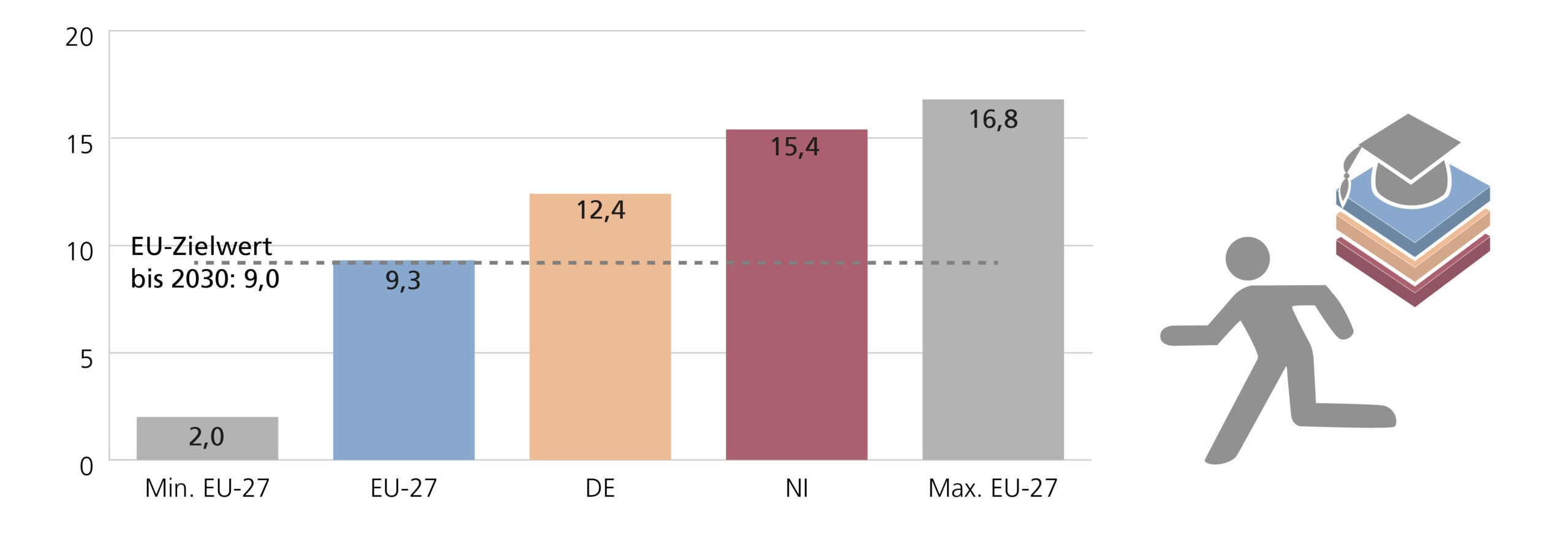 - Mit einem Anteil der frühen Schulabgängerinnen und Schulabgänger an der gleichaltrigen Bevölkerung von 15,4% liegt Niedersachsen über dem Durchschnitt der EU-27-Staaten von 9,3% und belegt den vorletzten Platz.