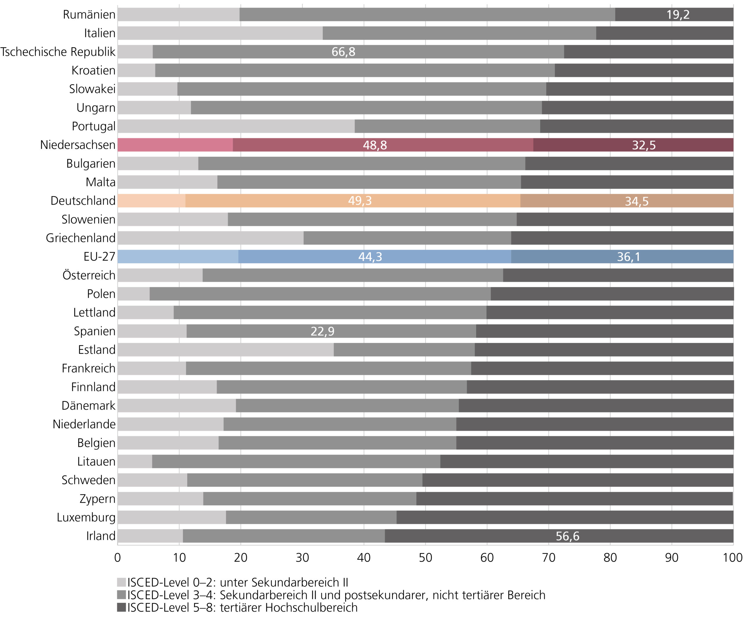 Die unterschiedliche Verteilung der verschiedenen Bildungsabschlüsse in den EU-Mitgliedstaaten verdeutlicht die Vielfältigkeit der Bildungssysteme zwischen den Ländern. Zusammengefasst wiesen 80,4% der 25- bis 64-Jährigen in der EU einen höheren Bildungsabschluss (ISCED-Level 3-8) auf (vgl. Abb. 2). Deutschland lag mit 83,8% etwas über dem EU-Durchschnitt (Niedersachsen: 81,3%). Spitzenreiter waren Polen (94,9%), Litauen (94,4%) und die Tschechische Republik (94,3%). Das Schlusslicht ist Portugal (61,5%), gefolgt von Spanien (64,9%) und Italien (66,7%).